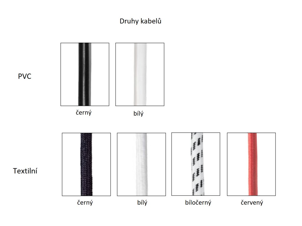 Textilní přívodní elektrický kabel je standardně dodáván v délce 1,5 m a je zakončen standardní zástrčkou. Prodloužení nebo zkrácení je možné na dotaz.