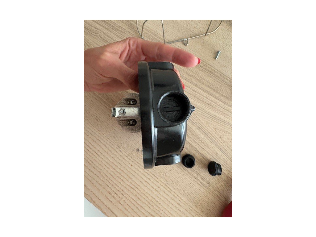 Použité materiály: základna svítidla je vyrobena z černého bakelitu, krytka je z lisovaného skla s drátěným ochranným košem.