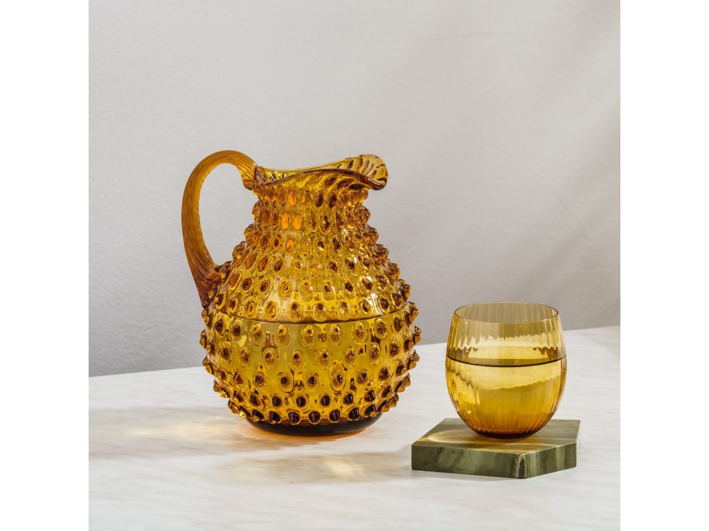 Ručně vyráběný džbán Polka Dot s originálním designem a nezaměnitelnou strukturou. Vyrobený z bezolovnatého křišťálu, vhodný na vodu a nealkoholické nápoje. Jasných barev bylo docíleno specifickým složením skloviny.